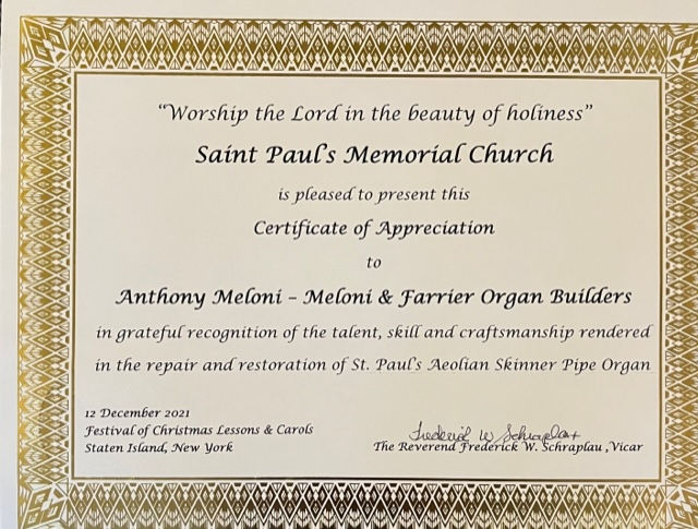 Offering more than three decades of expertise and experience, Meloni & Farrier Organbuilders is proud to be regarded as one of the premier restorers and builders of fine pipe organs in the New York Metropolitan area. Our goal is to provide the highest standard of workmanship, reliability and service to our clients.